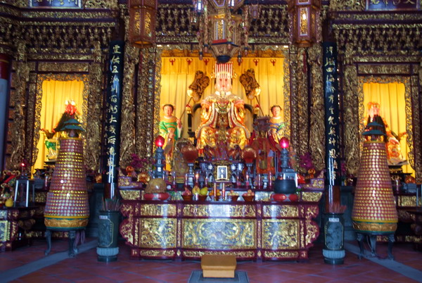 天后宮大殿同樣是木石結(jié)構(gòu),金黃色琉璃瓦屋面配以閩南式燕尾大脊,脊頂以彩瓷塑“雙龍朝寶塔”,飛檐有各色堆剪和卷草花飾,殿前臺明正面砌六幅青石浮雕,踏步中部嵌一幅“九龍勝云”浮雕御路石,整座大殿外觀氣勢恢宏。版權(quán)所有山東聊城聊之旅國際旅行社有限公司,轉(zhuǎn)載必究!大殿前廊八根圓形透雕青石大龍柱及大量石雕,絳紅色榔扇門窗,繪有大量寓意喜祥如意的圖案。大殿梁柱間的大部分彩繪以媽祖故事為主題,描金厚彩,富麗堂皇。殿內(nèi)供奉一尊高三點八米、寬二點一米的媽祖坐像。