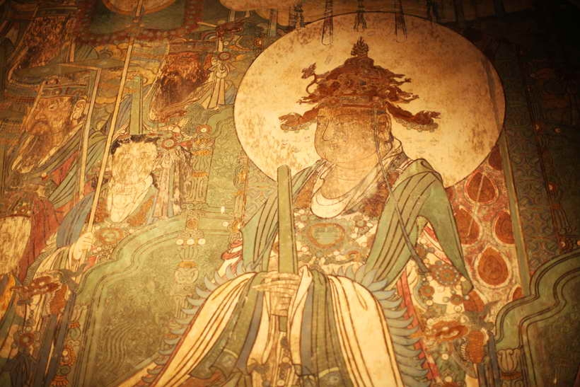 永樂宮的壁畫滿布在四座大殿內(nèi),壁畫總面積達960平方米。《朝元圖》描繪的是群仙朝謁元始天尊的情景:青龍、白虎兩神為前導,南極長壽仙翁和西王母等八個主神的四周,簇擁了雷公、電母、各方星宿神及龍、蛇、猴等多位神君,另有武將、力士、玉女在旁侍奉,全圖近300個神仙朝著同一個方向行進,形成了一道朝圣的洪流。在用色上,采用了傳統(tǒng)的重彩勾填方法。