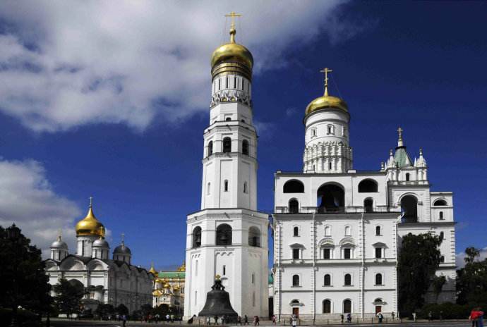 人們從遠(yuǎn)處遙望克里姆林宮,不難發(fā)現(xiàn)有一座建筑高高地矗立在建筑群體中,有鶴立雞群之感。這個(gè)高大建筑就是教堂廣場上的伊凡大帝鐘樓。它高81米,是古時(shí)的信號臺和望臺。鐘樓的左側(cè)有重達(dá)40 噸的炮王,右側(cè)是著名的鐘王。這兩個(gè)龐然大物雖然從未使用過,但卻顯示出了俄羅斯工匠高超的鑄造技術(shù)。