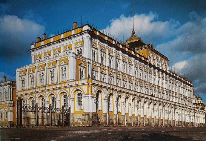 1838年,大克里姆林宮重建,全部由俄羅斯工匠采用本國建筑材料建成,外表看是三層建筑,實(shí)際是兩層,第一層向前突出,構(gòu)成一個(gè)露天陽臺,后來作為蘇聯(lián)政府、蘇共中央和社會(huì)團(tuán)體舉行會(huì)議的場所。