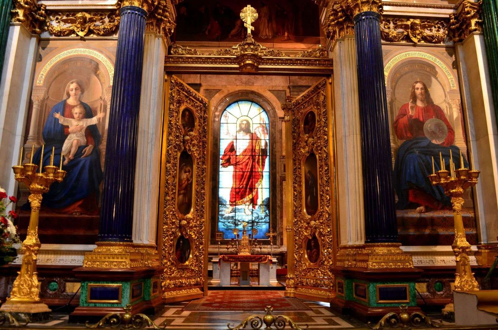 能同時容納1.5萬人的大教堂內(nèi)部,因采用大量珍稀彩色石料而顯得既莊重又華麗。主祭壇圣像壁65幅圣像以白色意大利大理石作框飾,用烏拉爾孔雀石壁柱分割,僅圣像壁的花銷就占去整個工程費用的10%。地面為棋盤狀深、淺灰色大理石方磚,中央是巨大的玫瑰花環(huán),由玫瑰紅和櫻桃紅大理石拼成。墻體上下分別為白色大理石和黑色板巖,以淺紅色和櫻桃紅色大理石作裝飾裙線。而150幅壁畫和馬賽克鑲嵌畫更從色彩上突出了整個空間的富麗堂皇。其中圓頂壁畫《圣母在圣徒的陪伴下》面積達800平方米,由著名畫家卡爾·布留洛夫(名作《龐培城的末日》的作者)等人創(chuàng)作。