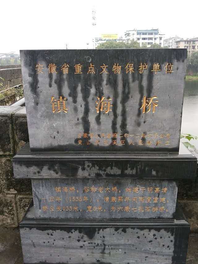 鎮(zhèn)海橋又名老大橋,為明嘉靖十五年(1536年)始建,清康熙十五年(1676年)重修,清康熙三十四年(1695年)再遭水毀,清康熙三十八年(1699年)再度重修,是連接屯溪老街和黎陽古鎮(zhèn)的交通樞紐。