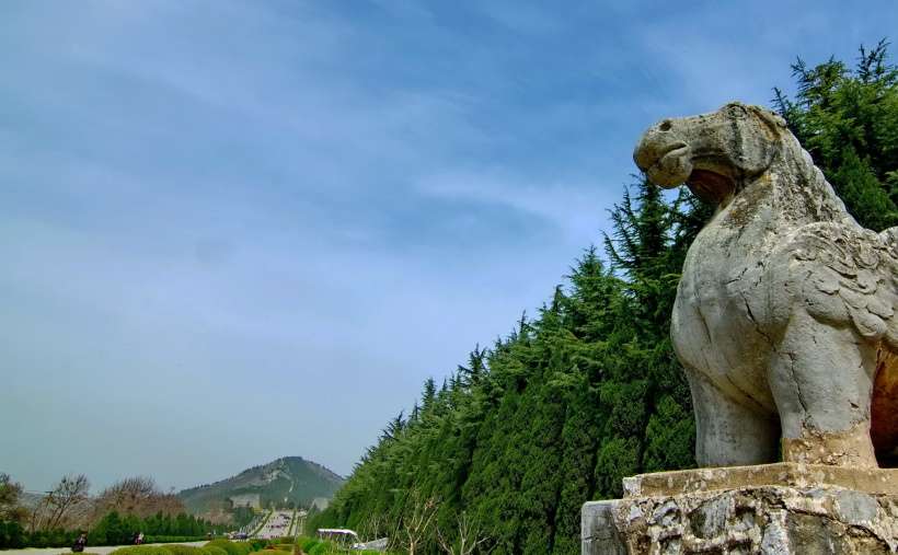 從梁山南二峰的天然雙闕起,往北依次對(duì)稱排列。端立首位的是1對(duì)高達(dá)8米有余的八棱柱石華表,這是帝王陵墓的標(biāo)志,其造型昭示著生命長(zhǎng)存的理念和古代先民對(duì)人類生殖行為的崇拜。接著是一對(duì)昂首挺胸、渾圓壯觀的石刻翼馬,馬身兩翼雕以卷云紋,似有騰飛之勢(shì)。翼馬之北是1對(duì)優(yōu)美的高浮雕鴕鳥(niǎo),是唐王朝同西域人民文化交流與友好往來(lái)的象征。緊接鴕鳥(niǎo)的是5對(duì)配有馭手的石仗馬和10對(duì)高4米左右的石翁仲(或稱直閣將軍)。