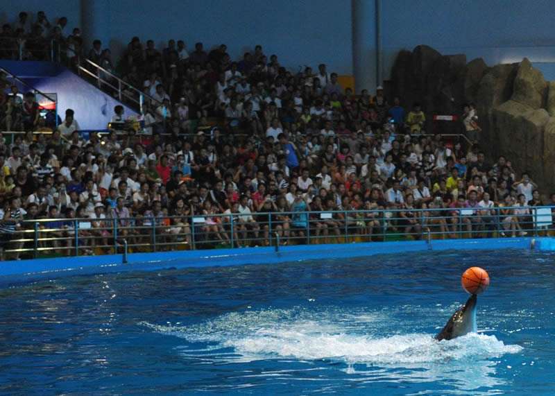 擁有1個(gè)大型表演池,3個(gè)寄養(yǎng)池,2000余個(gè)座位,可同時(shí) 3000余人觀看表演。游客們不僅可以近距離觀賞大白鯨、海豚、海獅等海洋動(dòng)物的精彩表演,還可以在表演臺(tái)上與海豚PK玩轉(zhuǎn)呼啦圈,與海豚握手、親吻,和它們零距離接觸。