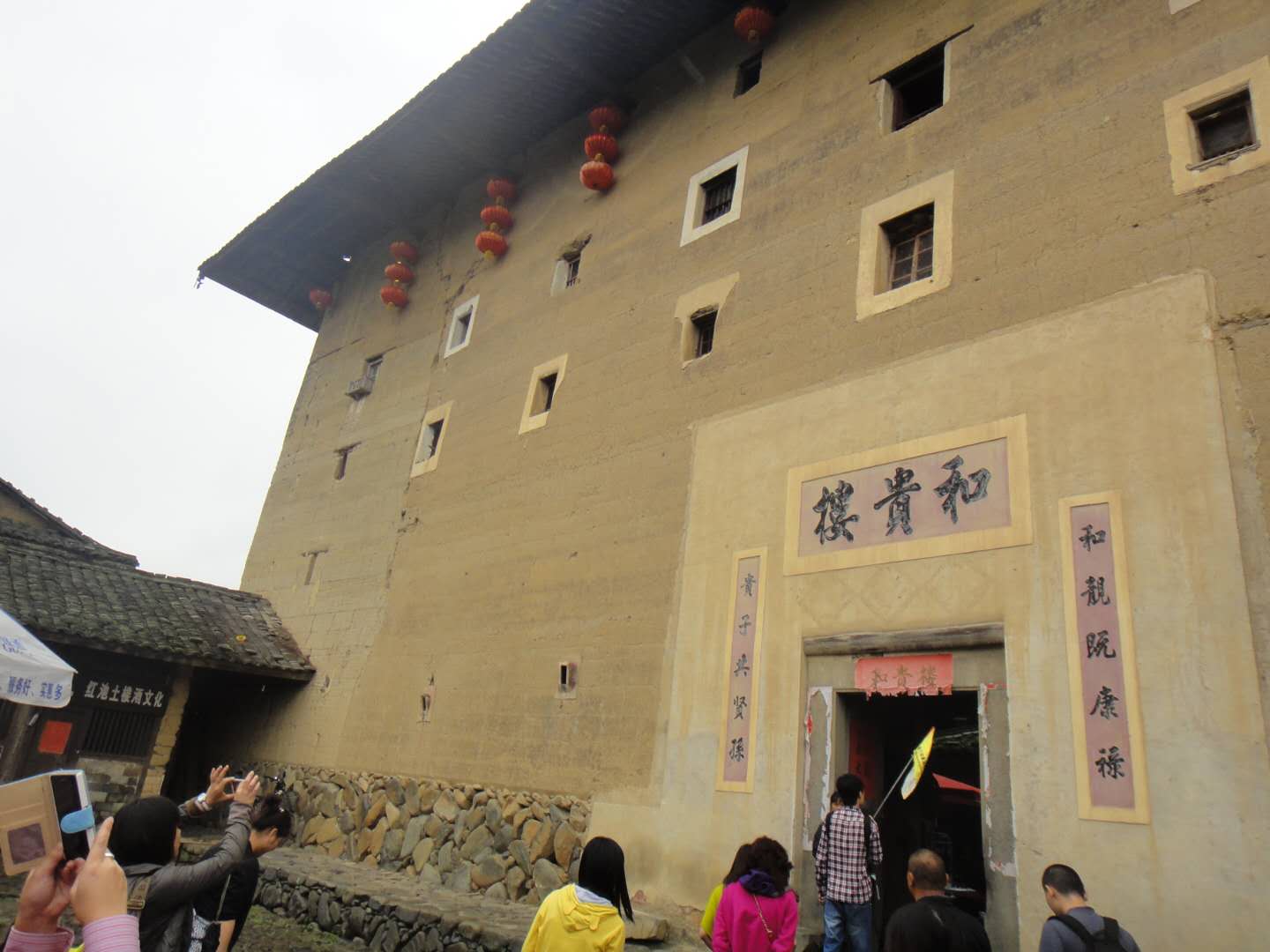 和貴樓每層有28個(gè)房間,共有140個(gè)房間。樓正中開一個(gè)大門,東西南北四方各有樓梯上下。它建于清雍正十年(1732年),據(jù)說當(dāng)初選址建樓,開始并未發(fā)現(xiàn)這是塊沼澤地,樓建了一層,忽然整層樓像沉船一樣,慢慢下沉到了爛地里,建樓的簡(jiǎn)姓族人無可奈何,只好在下沉的樓墻上打了100多立方米的排樁,他們覺得地基這下牢固了,就從頭開始夯墻,建起了一座五層高的方樓。他們似乎很有把握,從不擔(dān)心大樓會(huì)傾斜或者下沉,果然兩百多年來,和貴樓固若金湯,風(fēng)雨不動(dòng)安如山。現(xiàn)在,你在樓中學(xué)堂的小天井用鐵線往地