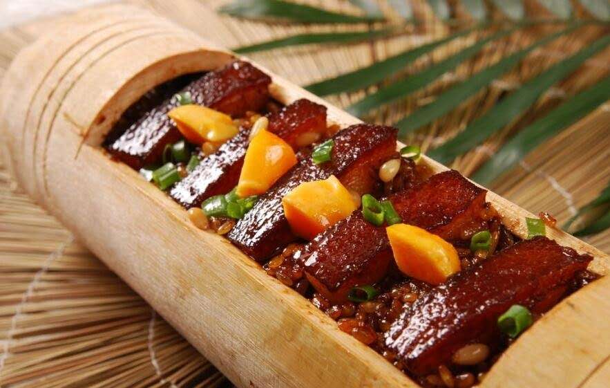 又稱竹筒飯。這種飯是在11月至來(lái)年2月,香竹成材之季,將糯米放在竹筒里烤制而成。香竹成材之季,將糯米放在竹筒里烤制而成。香竹的竹節(jié)長(zhǎng)而細(xì),內(nèi)壁有一層香氣撲鼻的竹膜,故稱為香竹。傣家人稱香竹"埋毫拉",意思是煮飯的竹。先把香竹按節(jié)砍下,每節(jié)留一竹節(jié),作為底。然后把淘泡過(guò)的糯米放入竹筒,用芭蕉葉塞住竹筒口,將竹筒放進(jìn)灰里捂(或放烤箱里、火炭上),竹筒口冒出蒸氣10分鐘后,即取出用木錘捶打,使其變軟,食之香味更濃。香竹飯軟而細(xì)膩,香氣撲鼻。一般用于招待客人,作為主食。用糯米加工成的食品很多,除香竹飯外,還有黃米飯、"毫諾索"(年糕)、"毫吉"、"毫松板"、米干、米線等40多種。