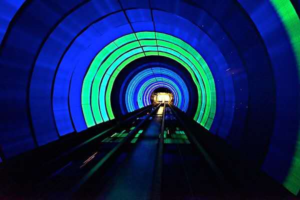 外灘觀光隧道通過聲、光、電、激光等高科技手段,在直徑僅6.76米、長646.7米的圓隧道內(nèi)制作五光十色的動(dòng)態(tài)景觀。雖然過江時(shí)間只有5分鐘,但游客將經(jīng)過八個(gè)景色不同、內(nèi)涵各異的景區(qū)。首先經(jīng)過的是“時(shí)光隧道區(qū)”。