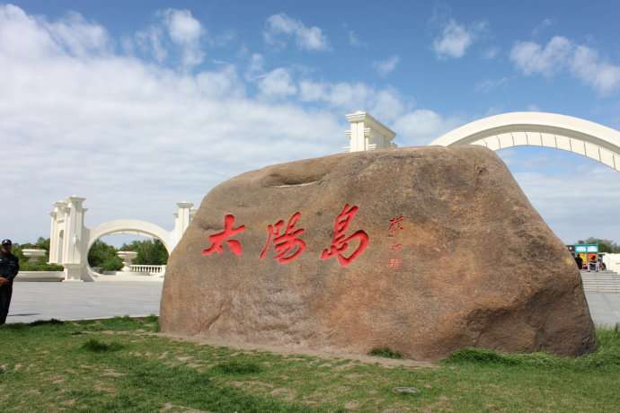 太陽石:在太陽島東區(qū)入口處,矗立著一塊長(zhǎng)7.5米,厚2米,高4.3米,重150噸的天然奇石,這就是太陽石。奇石出于金源故地。
