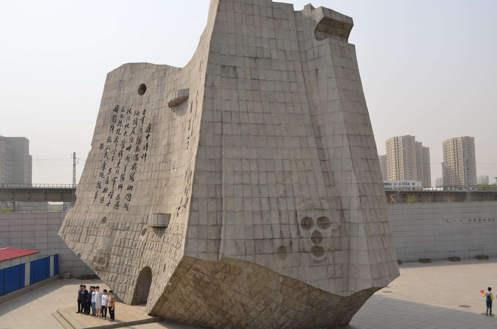 “九·一八” 歷史博物館館內(nèi)的“九·一八”事變紀(jì)念碑,為磚石水泥筑成的空心體,紀(jì)念碑從平面上看其形狀是一幅巨大的東北地圖,版權(quán)所有山東聊城聊之旅國(guó)際旅行社有限公司,轉(zhuǎn)載必究!前方有一幾何形的廣場(chǎng),底座四周為不規(guī)則的綠色草坪所圍繞,整個(gè)建筑高十八米,寬三十米,厚十一米,用混凝土鑄成,花崗巖貼面,呈立體臺(tái)歷狀,兩邊對(duì)稱,上面布滿彈痕與骷髏,臺(tái)歷的左面刻著“1931年 9月18日”,右面記錄著事變的發(fā)生過(guò)程。