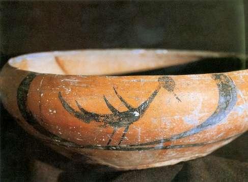 繪畫圖案古樸、簡練,可分三大類:一類為象生性圖案,如張口作吞食狀的魚、悠閑的鹿、搜索食物的蛙等動物紋,還有植物紋。這些象生圖案同史前人類的生活息息相關(guān),形態(tài)生動的動植物紋樣是農(nóng)耕和漁獵生活的反映。第二類為幾何圖案,有三角形,方格紋、編織紋等,這類圖案多在缽、罐、盆、壺類器皿外璧上部,許多缽類器口緣外側(cè)繪黑色寬帶紋,部分大口淺腹器皿的彩陶圖案多繪在內(nèi)壁上,小口器的圖案則繪在口唇和肩腹部,這些部位多是容易看得見的地方,多數(shù)圖案清晰,筆畫疏朗,這些幾何圖案中,三角紋是由魚紋圖案變化而來,波折紋則是山或水的寫意。