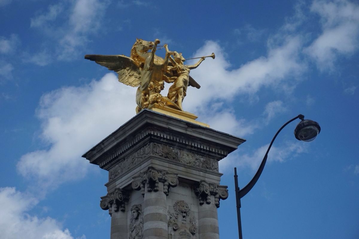 亞歷山大三世橋為全金屬結(jié)構(gòu)。大橋?qū)?/span>香榭麗舍大道及云斯頓 - 丘吉爾大道 (Av.W. Churchill) 兩側(cè)的 1900 年世博會的大小兩個展館(Grand Palais & Petit Palais)和塞納河南側(cè)的榮軍院連接起來。橋長107米,寬40 米,橋兩端各有兩座高17 米的橋塔。塔頂有象征著科學,藝術(shù),工業(yè)與商業(yè)四組金色的駿馬雕塑。它們即使在陰雨的天氣里也都金光閃閃,富麗堂皇。無論從塞納河的游船上還是艾菲爾鐵塔上都可以清楚地看到。