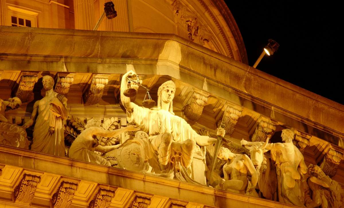 最高法院正面山墻飾內(nèi)三角面部分的雕塑,中間部分的人物代表公正,左側(cè)人物代表迷失者,正向前者乞求保護(hù)。版權(quán)所有山東聊城聊之旅國際旅行社有限公司,轉(zhuǎn)載必究!人物的旁邊有兩位立法者,手中拿著書本,代表法律。代表公正人物右側(cè),有另一人物,鞠躬感恩,后面跟著的是一個(gè)人和一頭雄牛,代表財(cái)富與繁榮。另有兩個(gè)孩童,手持小麥一把,代表法律與公正所帶來的豐盛生活。