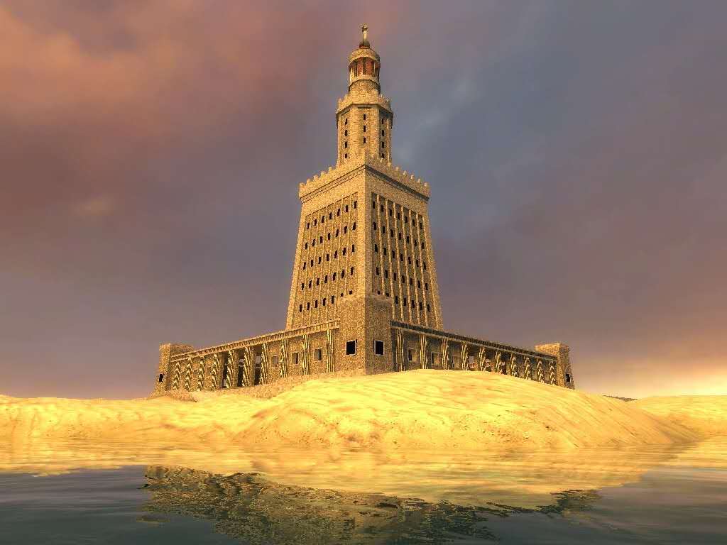 亞歷山大燈塔(The Lighthouse of Alexandria)高120米,加上塔基,整個高度約135米。塔樓由三層組成:第一層是方形結(jié)構(gòu),高60米,里面有300多個大小不等的房間,用來作燃料庫、機房和工作人員的寢室;第二層是八角形結(jié)構(gòu),高15米,用以存儲與輸送石油;第三層是圓形結(jié)構(gòu),上面用8米高的8根石柱圍繞在圓頂燈樓。燈樓上面,矗立著8米高的太陽神赫利俄斯站立姿態(tài)的青銅雕像。整座燈塔都是用花崗石和銅等材料建筑而成,燈的燃料是橄欖油和木材。整個燈塔的面積約930平方米。聰明的設(shè)計師還采用反光的原理,用鏡子把燈光反射到更遠(yuǎn)的海面上。這座無與倫比的燈塔白天日光閃耀,夜夜燈火通明,兢兢業(yè)業(yè)地為入港船只導(dǎo)航,它給舵手帶來了一種安全感。