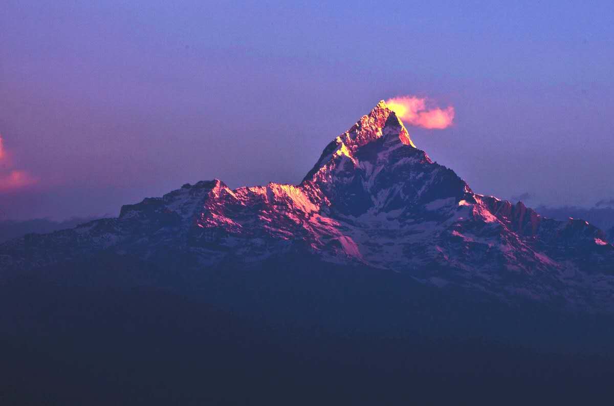 魚尾峰雖然不是尼泊爾最高的山峰,但卻成為尼泊爾的標志。從波卡拉的費娃湖附近,可以看到這座圣山和周圍峰群,突出于較低的山巒之上。