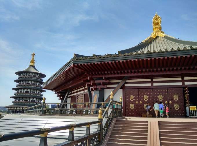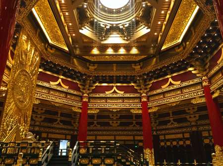 共三層,底層為四方形,四面各施一色,分別代表春夏秋冬四季。中層十二面效法一天中十二個時辰。頂層為圓形,四周環(huán)繞九龍雕塑。中間有周長十五米左右的巨型木柱,上下通貫,故此又名為萬象神宮。其建筑技術(shù)和施工技術(shù)驚世駭俗。