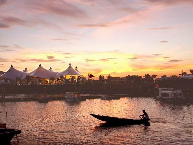 博鰲亞洲論壇會(huì)址建在三河出??诘奈髂习哆?,由五個(gè)巨大白色帳篷組成,遠(yuǎn)眺似天空飄浮的五朵白云;東面是三河出??诘母共?,前面寬闊的港灣和沙白如銀的玉沙帶;西面和南北面系博鰲水城,別墅星羅棋布。夜晚,萬(wàn)盞彩燈競(jìng)亮,猶如天上人間。