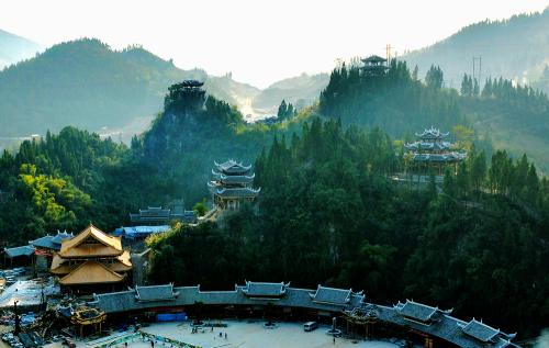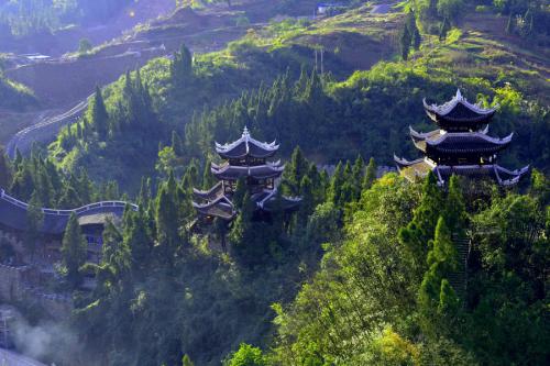 九黎宮:科學(xué)利用山水自然資源,因地制宜、依山造勢(shì),順山而居。宮高99米,呈11開間,象征九九歸一之意。建筑由四合院到吊腳樓到?jīng)_天樓三合為一,九黎宮內(nèi)有苗族接龍?zhí)?、曬樓虎口堂、四合院、八字朝門和吊腳樓群等多種文化符號(hào),是彭水展示苗族文化、民風(fēng)民俗的博物館,是目前最大的吊腳樓群。