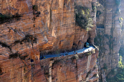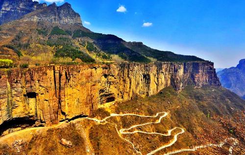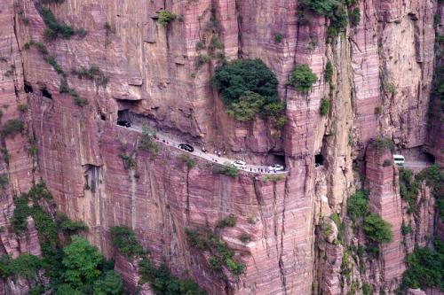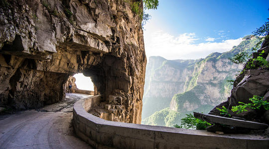 太行山大峽谷中共有六條掛壁公路,其中數(shù)郭亮村到王莽嶺的“昆山隧道"最為壯觀(郭亮村到王莽嶺最近的一條路),歷經(jīng)30年,人工開(kāi)鑿了一條由山西陵川王莽嶺通往河南輝縣郭亮的掛壁公路。