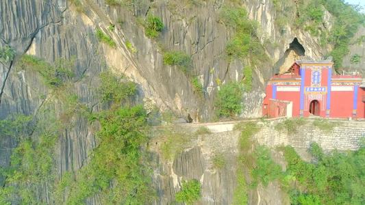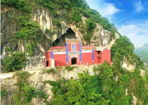 是當年蘇元春將息之所。依洞設景,別有天地。宮門進處,洞廳暢明,石刻滿壁?!肮哦撮L春”其左,“奠麗南邦”其右,書藝精湛,分外醒目。左洞上去,是一道朱門,雕龍刻鳳,氣宇軒昂。額題:“玉闕”。對開耳門,號曰“金階”。巨幅壁刻云,“遙通帝座”。沿“金階”上去,見一座金門,稱為“天闕”。左設左禁門,右置右禁門。洞府正中,一把巨大的石傘之下,數(shù)株石筍,宛若數(shù)名仙女,簇擁“天帝”?;厥咨砗螅坏缽姽鈴母哌h之處,穿山而下,那湛藍的天穹,恰似一面奪目的寶鏡,陽光就從那里直照到"天帝"的寶座之前。真是奇光天外來,滿洞放異彩。從宮右往“天橋”走去,爬到高遠的洞口,回身展望,又看到一道彩墻,圖案精美,玲瑰透剔,額題“萬物資始”。自此俯瞰山下,清溪如帶,田垌鋪金,村落點點。“保元宮”,結(jié)構(gòu)精美,金門重疊,朱戶畫墻,多彩多姿,真是富麗堂皇,勝似蓬萊。洞頂題詩云,“蜿蜒步上九重天,回首山河數(shù)點煙。如今方識保元妙,幾回夢魂到小連”。美妙的“保元宮”,確令游客駐足留連。