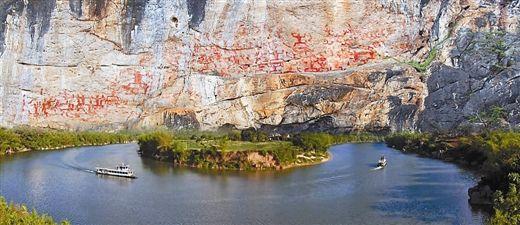 廣西左江流域的寧明、龍州、崇左、扶綏、大新、天等、憑祥等縣市的沿江地區(qū)都分布有崖壁畫,共79處,這些崖壁畫多集中在江河轉(zhuǎn)彎處寬大、平整、垂直壁上,陸地石壁和洞穴也有少量分布,花山崖壁畫是其中規(guī)模最大的,全幅畫長135米,高44米,分布在寧明縣明江耀達(dá)河段的花山崖壁上,畫有朱紅色人物1300多個;最大的高達(dá)3米,最小的僅0.3米,間有少量獸類和器具,規(guī)模宏大,內(nèi)容十分豐富。所畫人物有雙腳“八字”蹲、兩手上舉和雙腳下彎、兩臂前撐等姿態(tài)。每組畫中,常見一高大的人位于人群中央,腰佩刀劍,旁邊有銅鼓、狗和馬等形象,似是作戰(zhàn)會師、慶祝大會或集體娛樂等場面。據(jù)專家考證,這些崖壁畫繪制于戰(zhàn)國早期至東漢之間,是壯族先民通過圖騰崇拜以祈求五谷豐登、人丁興旺,其線條粗?jǐn)U,造型古樸,歷經(jīng)數(shù)千年風(fēng)雨侵蝕,依然清晰可見,不僅在廣西,在世界上也極為罕見。