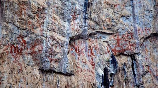 這些圖像在崖壁上錯綜呈現(xiàn),組成一幅幅完整的圖畫——典型的組合是一個高大魁偉、身佩刀劍的正身人像居中,腳下有狗,身旁有銅鼓,四周有眾多動作一致的側(cè)身人像。整個場面布局規(guī)整,疏密相間,動感十足,極像一場莊嚴(yán)又歡快的祭祀活動。這些色彩鮮艷、不斷重復(fù)的畫面,與山崖、河流和臺地共同構(gòu)成了神秘而震撼的文化景觀,被稱為“崖壁畫的自然展覽宮”、“斷崖上的敦煌”。