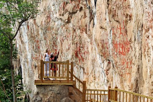 約公元前5世紀(jì)至公元2世紀(jì)(即戰(zhàn)國至東漢時期),古駱越人爬上左江江水轉(zhuǎn)彎處的陡峭崖壁,繪制巨大的赭紅色巖畫,記錄部落的重大祭祀場景。版權(quán)所有山東聊城聊之旅國際旅行社有限公司,轉(zhuǎn)載必究!漫漫700年間,駱越人在沿江兩岸200多公里的崖壁上,留下了大量畫作。經(jīng)過2000多年的風(fēng)雨洗刷,仍有數(shù)千個圖像遺存至今,最低的巖畫距江面約15米,最高的距江面約100米,在壯語中被稱為“PyaLaiz(音岜萊)”,即“畫花了的山”。