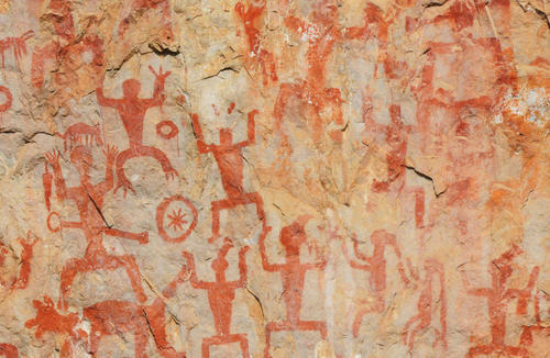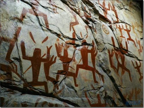 中國戰(zhàn)國至東漢繪制在崖壁上的圖畫。在廣西壯族自治區(qū)寧明縣東南14.5公里花山屯北明江東岸(見圖)?;?/span>山,壯語名為“岜來”,漢譯為“有畫的石山”。宋、明時代已有記錄。50年代初期調(diào)查發(fā)現(xiàn)。1988年中華人民共和國國務(wù)院公布為全國重點文物保護(hù)單位。 畫面臨江,崖壁明顯內(nèi)斜。畫面長約 172米,距江面最高約90余米,底部高出江面30米,距離山腳一級階地 3~10米不等。繪畫顏料是赭紅色的赤鐵礦粉,用動物脂肪稀釋調(diào)勻,用草把或鳥羽直接刷繪在天然崖壁上。畫法采用單一色塊平涂法,只表現(xiàn)所畫對象的外部輪廓,沒有細(xì)部描繪。風(fēng)格古樸,筆調(diào)粗獷,場面十分壯觀?,F(xiàn)存圖像1900多個,包括人物、動物和器物 3類,以人物為主。人物只畫出頭、頸、軀體和四肢,無五官等細(xì)部?;驹煨头终砗蛡?cè)身兩種。正身人像形體高大,最大的高達(dá) 2米以上,皆雙臂向兩側(cè)平伸,曲肘上舉,雙腿叉開,屈膝半蹲,腰間橫佩長刀或長劍。側(cè)身人像數(shù)量眾多,形體較小,多為雙臂自胸前伸出上舉,雙腿前邁,面向一側(cè),作跳躍狀。