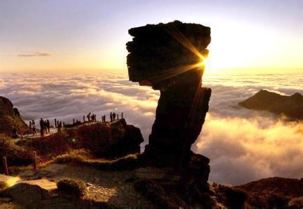 老鷹巖:梵凈山頂一塊似鷹嘴的巖石,這是一方聳立在山巔的巨石,其形狀像一只神情嚴(yán)視,展翅欲飛的天鷹,屹立于山巔。