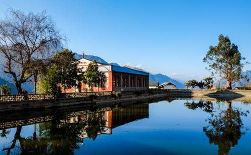 老姆登教堂,青磚墻,紅漆木窗,白鐵皮屋頂,簡(jiǎn)單樸素。從外表看,這座教堂并不壯觀,沒(méi)有常見(jiàn)的玻璃彩窗、穹頂、和標(biāo)志性的哥特式尖塔,有的只是長(zhǎng)條凳和紅漆木窗,但這更顯出人們信仰的純粹和虔誠(chéng)。每個(gè)星期天(周三、周六晚上八點(diǎn)亦有),周邊鄉(xiāng)村的基督教信徒都會(huì)集中在這里做禮拜,他們聚集在這里虔誠(chéng)的念誦贊美詩(shī),對(duì)于那些和著太陽(yáng)和泥土味道的樸實(shí)的人民,上帝就住在他們心里,他們像呼吸一樣自然安詳虔誠(chéng)的哼出那些歌謠。村民唱圣歌是用傈僳語(yǔ)唱的,傈僳族的文字始自圣經(jīng)的翻譯,也為怒族所共用。