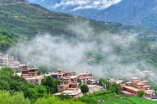 “甲居”,藏語是百戶人家之意。藏寨從大金河谷層層向上攀緣,一直伸延到卡帕瑪群峰腳下,整個山寨依著起伏的山勢迤邐連綿,在相對高差近千米的山坡上,一幢幢藏式樓房灑落在綠樹叢中?;蛐橇_棋布,或稠密集中,或在高山懸崖上,或在河壩綠茵間,不時(shí)炊煙裊裊、煙云繚繞,與充滿靈氣的山谷、清澈的溪流、皚皚的雪峰一起,將田園牧歌式的畫卷展示在人們眼前,以一種藝術(shù)品的形態(tài)存在。2005年由《中國國家地理》雜志組織的選美中國活動中,以甲居藏寨為代表的“丹巴藏寨”被評為“中國最美的六大鄉(xiāng)村古鎮(zhèn)”之首。