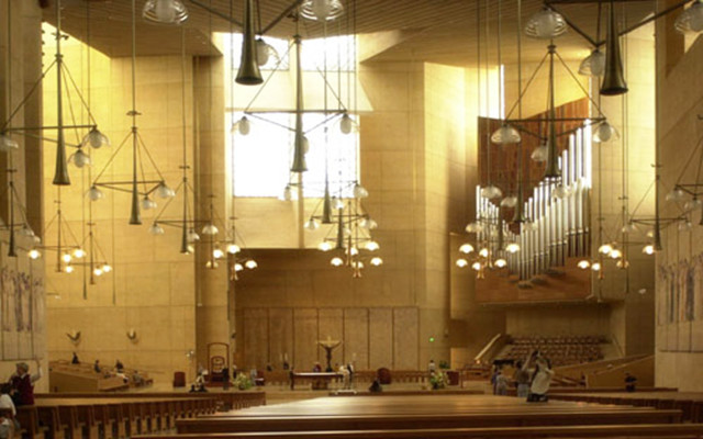 教堂占地二千余平方尺,頂部為鐘樓。禮堂高大寬敞,可容二百多教友同時(shí)參加儀式;圣壇上置圣母像,據(jù)說是從歐洲運(yùn)來;其兩側(cè)有數(shù)尺高的天使像,造型栩栩如生,是為紀(jì)念建堂百周年而置。