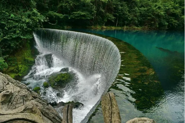 犀牛潭是九龍河大瀑布下面的最后一個潭,從這個潭開始,就是站在大瀑布上可以一收眼底的一目十瀑。從以堵勒村及鴨子龍?zhí)哆^河對岸,就從潭上邊河床上的蛤蟆石走過。這個潭也不大,但就是怪,有時從上邊流下來的水是清的,可再從潭里流出來,就變成了渾的。老輩人說:“那是正好碰上犀牛翻身哩!”