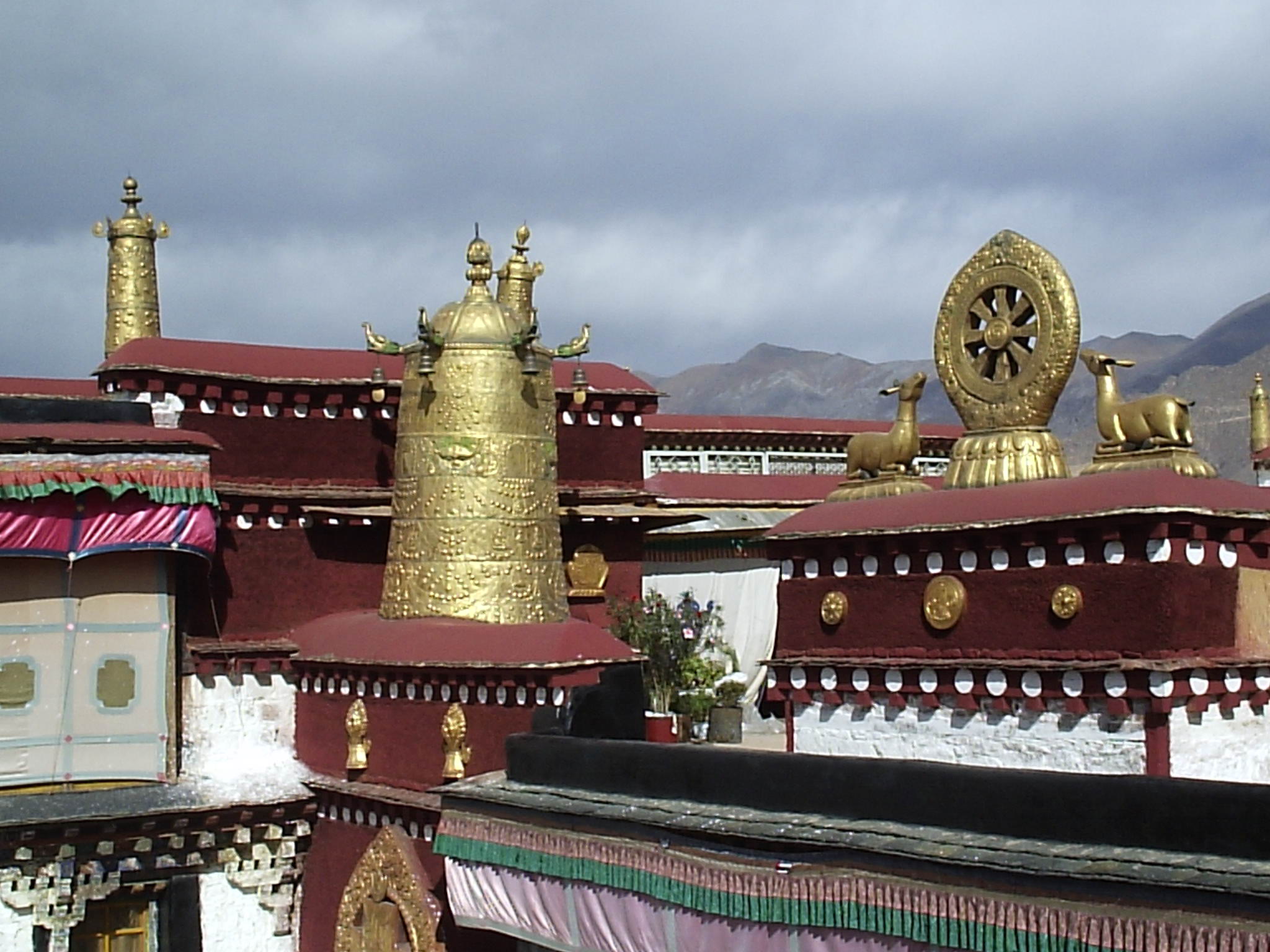 從大昭寺金頂俯瞰大昭寺廣場,右邊遠(yuǎn)處山上是布達拉宮,近處的柳樹是“公主柳”,相傳是文成公主所栽。大昭寺的布局方位與漢地佛教的寺院不同,其主殿是坐東面西的。主殿高四層,兩側(cè)列有配殿,布局結(jié)構(gòu)上再現(xiàn)了佛教中曼陀羅壇城的宇宙理想模式。寺院內(nèi)的佛殿主要有釋迦牟尼殿、宗喀巴大師殿、松贊干布殿、班旦拉姆殿(格魯派的護法神)、神羊熱姆杰姆殿、藏王殿等等。寺內(nèi)各種木雕、壁畫精美絕倫,空氣中彌漫著酥油香氣,藏民們神情虔誠地參拜轉(zhuǎn)經(jīng)。