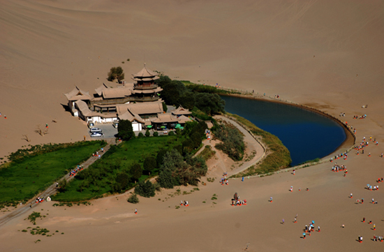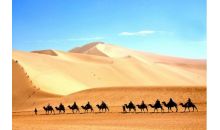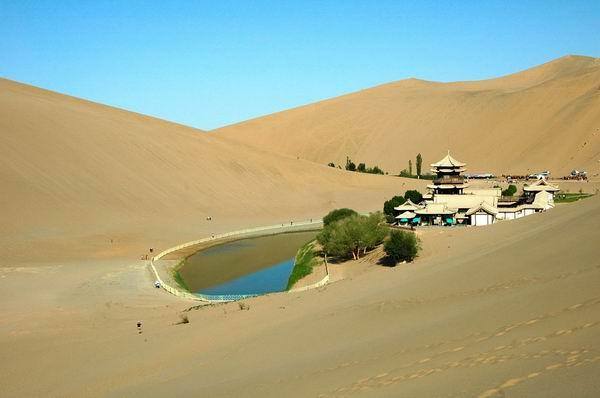 鳴沙山位距敦煌市南郊5公里,因沙動(dòng)成響而得名。山為流沙積成,分紅、黃、綠、白、黑五色。漢稱沙角山,又名神沙山,魏晉時(shí)始稱鳴沙山。其山東西綿亙40余公里,南北寬約20余公里,沙壟相銜,盤桓回環(huán)。其特點(diǎn):“峰巒陡峭,山脊如刃;馬踐人馳,殷殷有聲;輕若絲竹,重如雷鳴;沙隨足落,經(jīng)宿復(fù)初。”