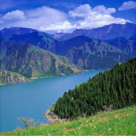 新疆天山天池風(fēng)景名勝區(qū)以天池為中心,包括天池上下4個完整的山地垂直自然景觀帶,總面積380.69平方公里。天池湖面呈半月形,長3400米,最寬處約1500米,面積4.9平方公里,最深處約105米。湖水清澈,晶瑩如玉。四周群山環(huán)抱,綠草如茵,野花似錦,有“天山明珠”盛譽。挺拔、蒼翠的云杉、塔松,漫山遍嶺,遮天蔽日。天池自然保護(hù)區(qū)可分為“大天池北坡游覽區(qū)”、“大天池游覽區(qū)”、“十萬羅漢涅般木山游覽區(qū)”、“娘娘廟游覽區(qū)”和“博格達(dá)峰北坡游覽區(qū)”,每區(qū)八景,五區(qū)四十景。