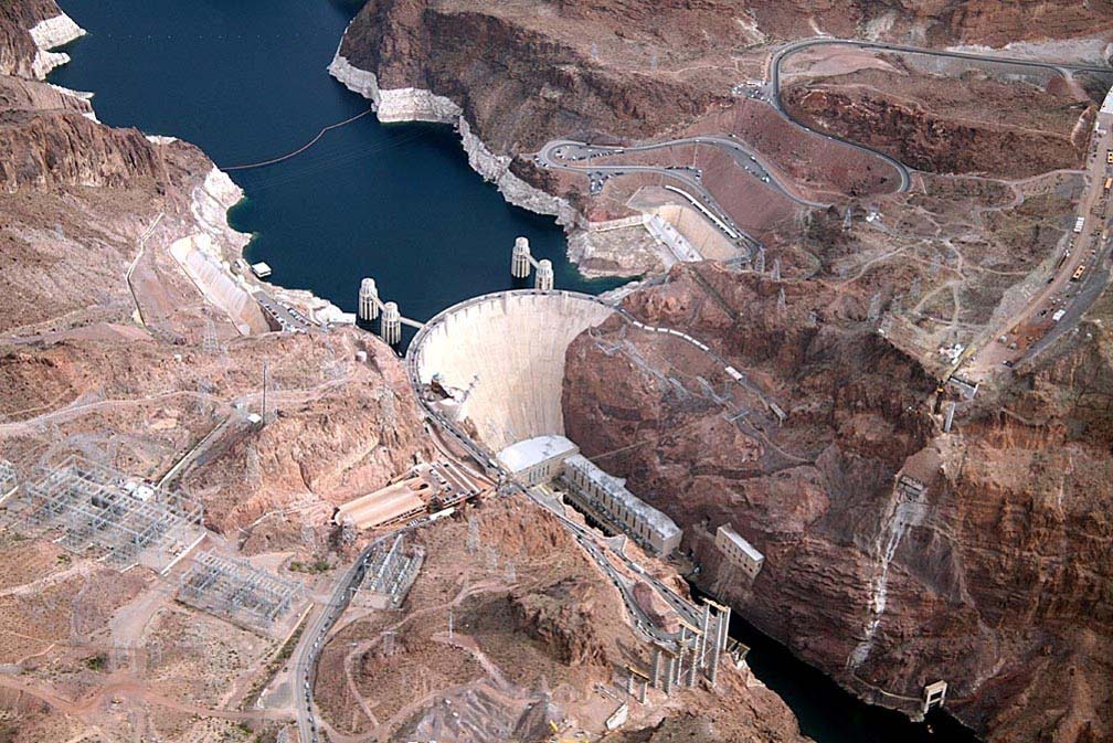 胡佛水壩(Hoover Dam)是美國(guó)綜合開發(fā)科羅拉多河(Colorado)水資源的一項(xiàng)關(guān)鍵性工程,位于內(nèi)華達(dá)州和亞利桑那州交界之處的黑峽(Black Canyon),具有防洪、灌溉、發(fā)電、航運(yùn)、供水等綜合效益。 大壩系混凝土重力拱壩,壩高221.4m,大壩形成的水庫(kù)叫米德(Mead)湖,總庫(kù)容348.5億立方米,水電站裝機(jī)容量原為134萬kW,現(xiàn)已擴(kuò)容到208萬kW,計(jì)劃達(dá)到245.2萬kW。于1931年4月開始動(dòng)工興建,1936年3月建成,1936年10月第一臺(tái)機(jī)組正式發(fā)電。