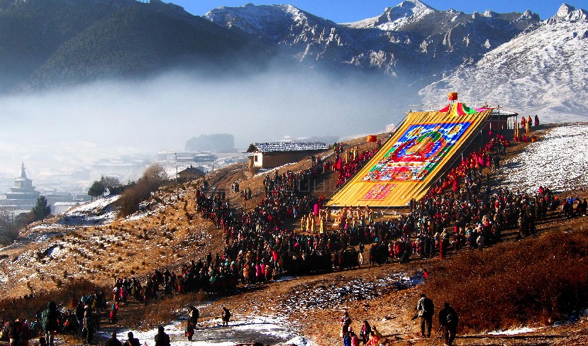 其中有1757年清代乾隆皇帝賜予該寺鑲滿金銀珠寶、書有漢滿蒙藏四種文字的盔甲,國家特級文物、純金汗書寫而成的藏文《大藏經》中的整套《甘珠爾》佛經,由十六羅漢和四大天王等組成的整套二十四幅的緙絲唐卡“唐繡”,這些文物都展示出明清兩代中央政府和西藏地方之間的親密關系。其中二十四幅要展示三周,形成了該寺一年一度規(guī)模盛大的“甘丹繡唐節(jié)”。
