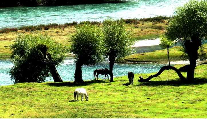 尼洋河在源頭是一條細(xì)流,它奔流向前,越流越急。它要沖破各種阻力和障礙,不急不行。到了中游以下,河面已越流越寬,水流也漸漸平緩了下來(lái)。這時(shí)的尼洋河已漸入佳境,河水中,可以看到對(duì)岸青山綠樹(shù)的清晰倒影了。天上的白云也到尼洋河里來(lái)游蕩,它們?cè)诤永锱獫窳艘律?,一件一件都掛到天上去晾曬。這時(shí)想到一個(gè)詞:行云流水。這是一種難以言語(yǔ)的美妙境界,創(chuàng)造這個(gè)美妙詞匯的人,當(dāng)他獲得靈感的那一刻,我想他的心靈肯定已和大自然的美景融為一體了。