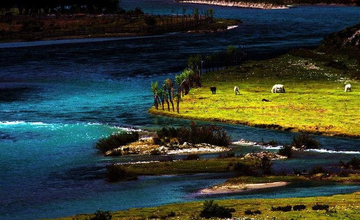 尼洋河之美,美在它的水色。那個(gè)清澈,那個(gè)翡翠般的綠,那個(gè)飛濺的潔白的浪花。清澈、翠綠、潔白,這三種視覺(jué)效果是紛紛攘攘、難分難辨地交融在一起的。藏族人崇拜大自然,他們祖祖輩輩用神話故事、美妙歌舞膜拜大山、贊美江河。他們形容西藏的江河用了一個(gè)詞:飛花碎玉。哦,飛花碎玉的尼洋河。