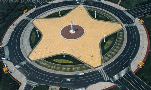 從廣場(chǎng)中央大道中心點(diǎn)往北500米是會(huì)展中心;往南是百年城雕廣場(chǎng),500米外是藍(lán)色的大海。中央大道紅磚鋪地,兩側(cè)綠草如茵,每隔20米設(shè)一個(gè)航標(biāo)燈造型的石柱燈,象征著中國正面向大海,走向世界。