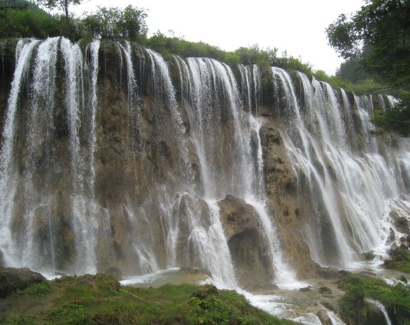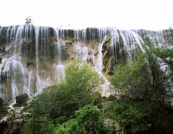 凌空而瀉的瀑布,象銀河倒懸,墜至半空,忽被峭石攔腰斬?cái)?,剎時(shí)雪浪飛濺,宛如千萬串?dāng)嗑€的珍珠,紛紛揚(yáng)揚(yáng),沿懸立千紉的絕壁陡然下墜,落進(jìn)不見底的深淵,發(fā)出驚天動(dòng)地的狂嘯。而河水卻象兇猛的野獸在咆哮,發(fā)出震耳欲聾的吼聲,仿佛整個(gè)峽谷在顫動(dòng)。每到日落西山,“老虎嘴”彩虹繚繞,雪峰頂上緋紅一片,迷離變幻,奇勝不可名狀。