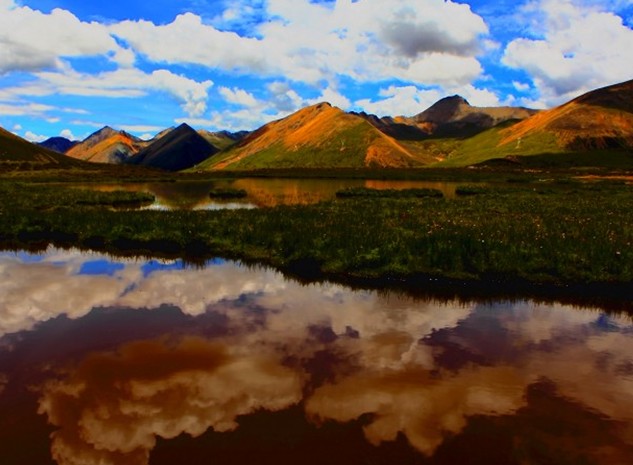 據(jù)藏文古籍《五部遺教》等藏文記錄,墨竹思金拉措神湖位于猶如聚寶盤(pán)里用金銀財(cái)寶向四周供奉曼陀羅。其間,藍(lán)天倒映在湖中。而墨竹思金龍王以雪域財(cái)主的身份把財(cái)寶撒在大地上,撒滿(mǎn)整個(gè)雪域山川,并用各種珍貴藥材及樹(shù)木、鮮花、野生動(dòng)物將其點(diǎn)綴,。神湖后面形如龜王的山上有蓮花生大師修行的“仲巴”巖洞及許多歷史悠久的修禪靜地和生成之物。