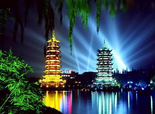 桂林日月雙塔號稱世界第一銅塔,是桂林旅游的一個絕美夜景觀賞地。地處桂林市中心區(qū),座落在桂林城的中軸線上,與“象山水月”相鄰。象山是桂林的城徽,而雙塔則是新桂林的標識。其中日塔高41米共九層,通體均為純銅裝飾,耗用銅材350噸,金碧輝煌,并有電梯供游客觀光乘坐。銅塔所有構件如塔什、瓦面、翹角、斗拱、雀替、門窗、柱梁、天面、地面完全由銅壁畫裝飾,整座銅塔創(chuàng)下了三項世界之最——世界上最高的銅塔,世界上最高的銅質建筑物,世界上最高的水中塔。 月塔高35米共七層,為琉璃塔。每層的雕花彩繪門窗寓意不同的主題,富含中國傳統(tǒng)韻味,通過水下18米長的水族館與日塔連接,其地宮之中有桂林明代青花梅瓶大型壁畫。杉湖日月雙塔已成為觀賞桂林城市精華美景的勝地。