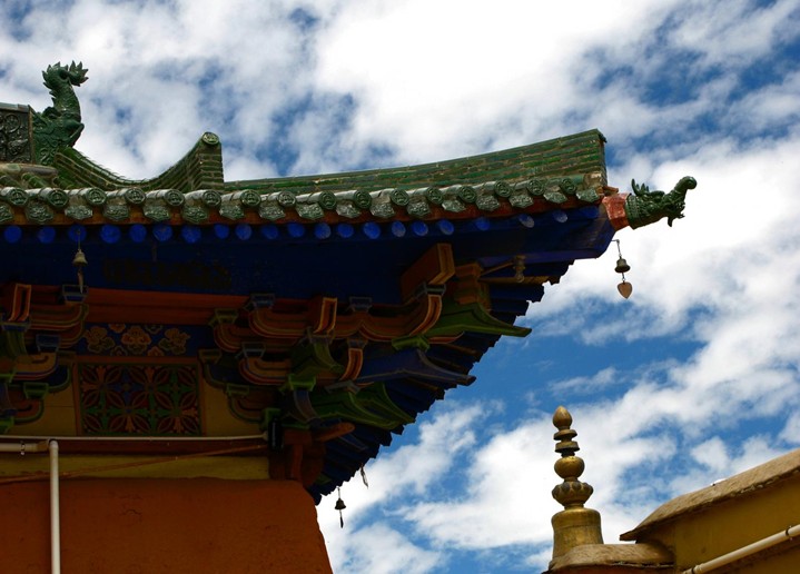 寺的大殿,分前后正殿及左右配殿。大殿的底層是合成一體,二層以上則四殿分立。皆為木構(gòu)梁架琉璃瓦頂。這是一座具有西藏傳統(tǒng)形式與內(nèi)地結(jié)構(gòu)造型相結(jié)合的,特殊風格的古建筑群。