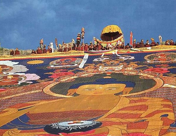 雍仲林寺的重要殿堂通追拉康,位于寺院東北側(cè)。通,意為“見”;追,意為“解脫”。顧名思想朝圣者來到這時,僧人們就會主動給你敬圣水。拉康面積約80平方米,殿內(nèi)供奉的5座靈塔,“文革”時全部被毀,現(xiàn)已將其中最大的江袞•達哇堅贊塔修復(fù),高達5米,鑲嵌黃金2公斤。殿內(nèi)一對銀燈和一個曼荼羅,各用70個銀元制成。殿內(nèi)繪有壁畫:中央壁上繪有江袞•達哇堅贊畫像;四壁繪有苯教祖師頓巴辛饒的千佛像。