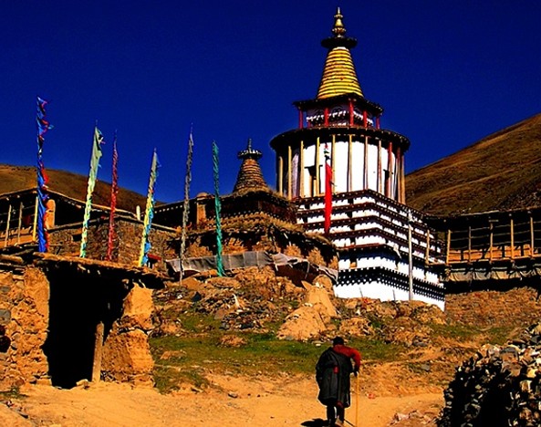 覺囊寺坐落在日喀則拉孜縣歐布瓊山山腰處,海拔4600米。始建于公元十二世紀,由貢巴•土杰尊珠主持修建。該寺曾有二萬多名僧人,在歐布瓊山上有二千多處修行洞和坐禪房,并修建了一座“萬佛一見得解塔”,塔高約27米,塔型呈“時輪壇城”,有108個門、108個殿堂。主供佛為喜繞堅贊師徒三尊佛。每年藏歷4月15日,該寺舉行“時轉(zhuǎn)跳神”活動。