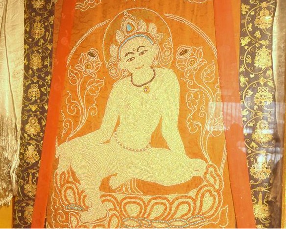 此外還有文成公主親手繡制的釋迦牟尼唐卡,它與珍珠唐卡均保存在大殿樓頂二層最靠后的一間房里,平時(shí)游客稀少時(shí)不開放,需要去找管鑰匙的人將門打開。