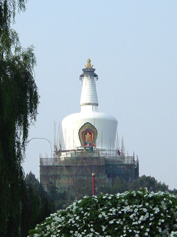 北海白塔—藏傳喇嘛塔 于清初順治八年(1651年),是一座藏式喇嘛塔。據(jù)建塔石碑記載,當(dāng)時"有西域喇嘛者,欲以佛教陰贊皇猷,請立塔寺,壽國佑民",得到皇帝的恩準,于是修建了永安寺和白塔。塔高35.9米,上圓下方,富有變化,為須彌山座式,塔頂設(shè)有寶蓋、寶頂,并裝飾有日、月及火焰花紋,以表示"佛法"象日、月那樣光芒四射,永照大地。塔身正面有一盾形小龕,內(nèi)塑紅底黃字的藏文圖案,含"吉祥如意"之意。此龕俗稱"眼光門",又叫"時輪金剛門"。1679年該塔被地震所毀,次年重建。1976年唐山地震波及北京,塔頂被損。在修復(fù)時,發(fā)現(xiàn)塔內(nèi)主心木中藏有一個二寸見方的金漆盒子,盒蓋繪有太極圖,盒內(nèi)藏有兩"舍利",證明此塔是一座舍利塔。該塔矗立于瓊島頂峰,綠蔭擁簇,巍峨壯美,引人矚目。這種象征神權(quán)的建筑物--白塔和永安寺,設(shè)置于瓊島的重要位置上,具有主宰全園的氣勢,以體現(xiàn)"君權(quán)神授"的封建思想,此是帝王宮苑的一大特色。