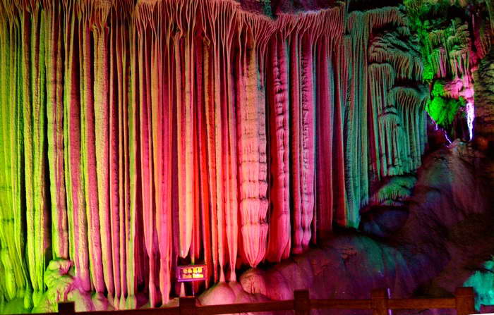 進(jìn)入景區(qū),似步入世外桃源,群山環(huán)抱,碧水潺潺,楊柳婀娜,桃花滿園。古寨依山而座,炊煙裊裊,雞犬相聞,淳樸的鄉(xiāng)風(fēng)讓人迷醉,飲一碗地道的油茶,品一杯香醇的水酒,傾聽(tīng)關(guān)于銀子巖的神秘傳說(shuō),讓人忘卻紅塵,不忍歸去。走進(jìn)銀子巖,如水般的清涼和平靜撲面而來(lái);明白了栩栩如生、惟妙惟肖、巧奪天工。贊嘆、驚訝、緊張,銀子巖的鐘乳石奇形怪狀,在各色燈光的照射下,一條條石筍上就像綴滿了銀粉,白的像一塊塊玉石,紅的似一簇簇珊瑚,綠的若一片片翡翠,黃的如一顆顆琥珀。燈光與天然的石筍融為一體,好一個(gè)人間仙境。穿行在銀光四射、熠熠生輝的石府中,游客會(huì)深刻地領(lǐng)悟到銀子巖三個(gè)字的由來(lái)。巖洞有老中青幼四種不同年紀(jì)的石鐘乳,老的色澤蒼黃,中青年的則白里透黃,色澤明艷,幼年則銀白如玉。銀子巖地貌奇特,有偉岸的音樂(lè)石屏,彈指有聲,聲如天籟;有繽紛的林海雪原,寬闊遼遠(yuǎn),不知其源頭;地面的沖積巖酷似萬(wàn)里長(zhǎng)城,蜿蜒起伏在洞穴之中;巖頂?shù)墓质跓艄獾妮x映下,有的巨大的豎琴排列齊整,有的像南天一柱的定海神針,有的如獅虎猛獸,有的像入定高僧,有的似域外仙人,奇美景象應(yīng)接不暇。宛如漫步在廣寒宮,幻象不斷。