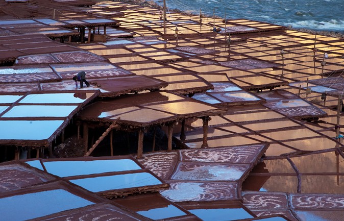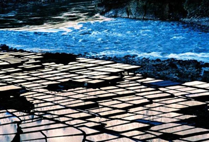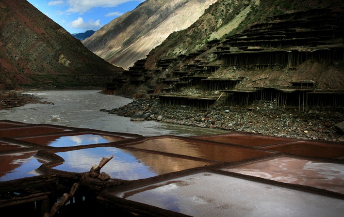 鹽井自古就有產(chǎn)鹽的歷史,而鹽田又成為這里獨(dú)有的一道人造景觀。所謂的鹽田,其實(shí)是在洶涌澎湃的瀾滄江邊搭建的一些土木結(jié)構(gòu)的平臺。順著鹽田之間的小道下坡,鹽水井就挖在江邊。這兒的鹽水井有的深近10米,工人們身背圓柱形的木桶,將鹵水存儲在鹽田邊的槽溝里,其他的工人將鹵水從槽內(nèi)舀出倒入鹽田里。經(jīng)過一天日頭的暴曬和江風(fēng)的吹拂,第二天,鹽田里就會結(jié)晶出白色的鹽粒了。 依山搭建層層的鹽田氣勢雄偉,鹽民們沿著祖先的足跡,走在崎嶇險(xiǎn)峻的小道上辛勤地勞作,在延續(xù)生命的同時(shí)也創(chuàng)造著世界上獨(dú)特的景觀。